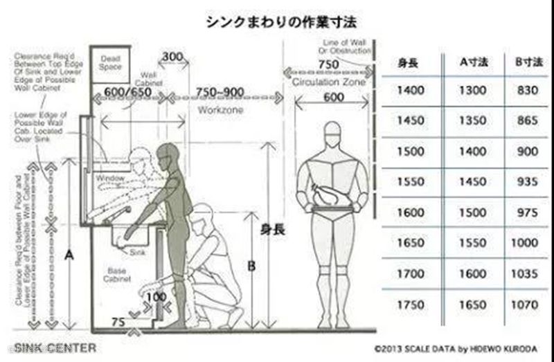 平面尺寸决定后,立面操作台也不能忽略。关于身高和操作台高度的对比,可以参考下图。水池的高度则建议在B以下100mm。
