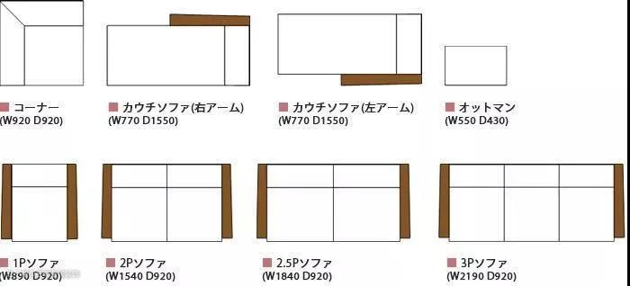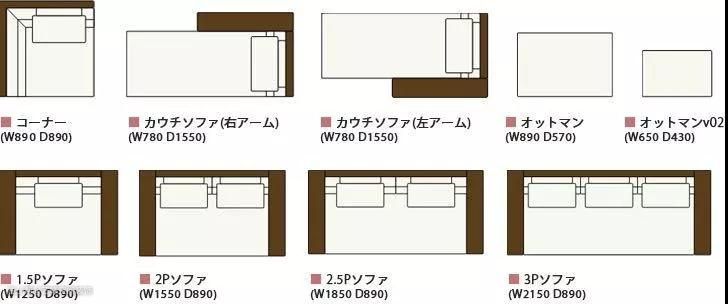矮式沙发的宽度一般为890mm,相对较宽,占用的空间面积也更大一些。下图是不同矮式沙发的长宽示意图。单人沙发可选择1.5P样式、双人则可选择2P或2.5P样式,以此类推。