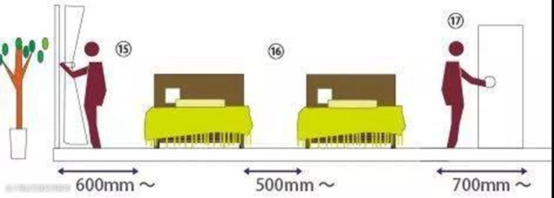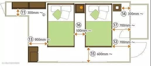 卧室作为使用时间最久的居室,其布局也有很多讲究。下图以两张单人床为例,给出了一些具体的尺寸参考。