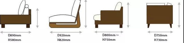 常见的沙发样式包括:矮式、高背式、标准式、紧凑式四种,每一种沙发的长(W)、宽(D)、高(H)差别都很大。各类沙发容纳的人数不同、尺寸也不同。
