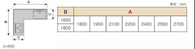 L型厨房中,两边操作台进深(C)一般是550-650mm,长宽可以参考下图。