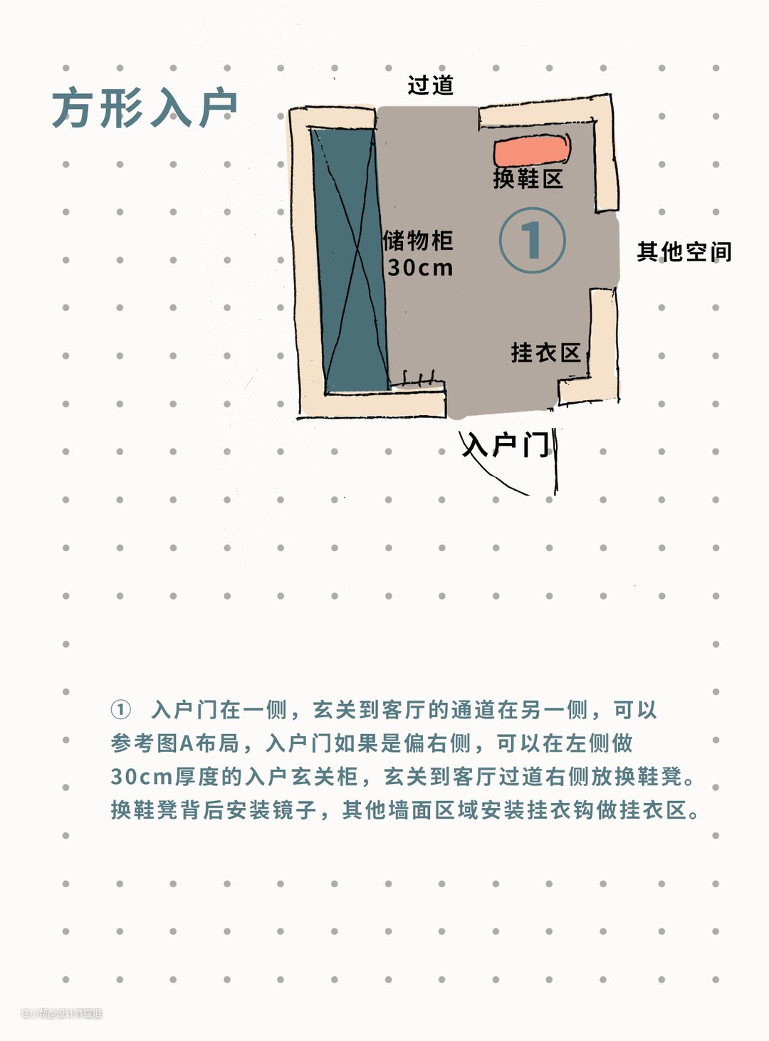 ① 入户门在一侧,玄关到客厅的通道在另一侧,可以参考图A布局,入户门如果是偏右侧,可以在左侧做30cm厚度的入户玄关柜,玄关到客厅过道右侧放换鞋凳。换鞋凳背后安装镜子,其他墙面区域安装挂衣钩做挂衣区。
