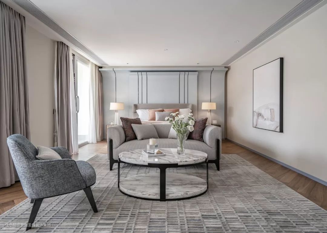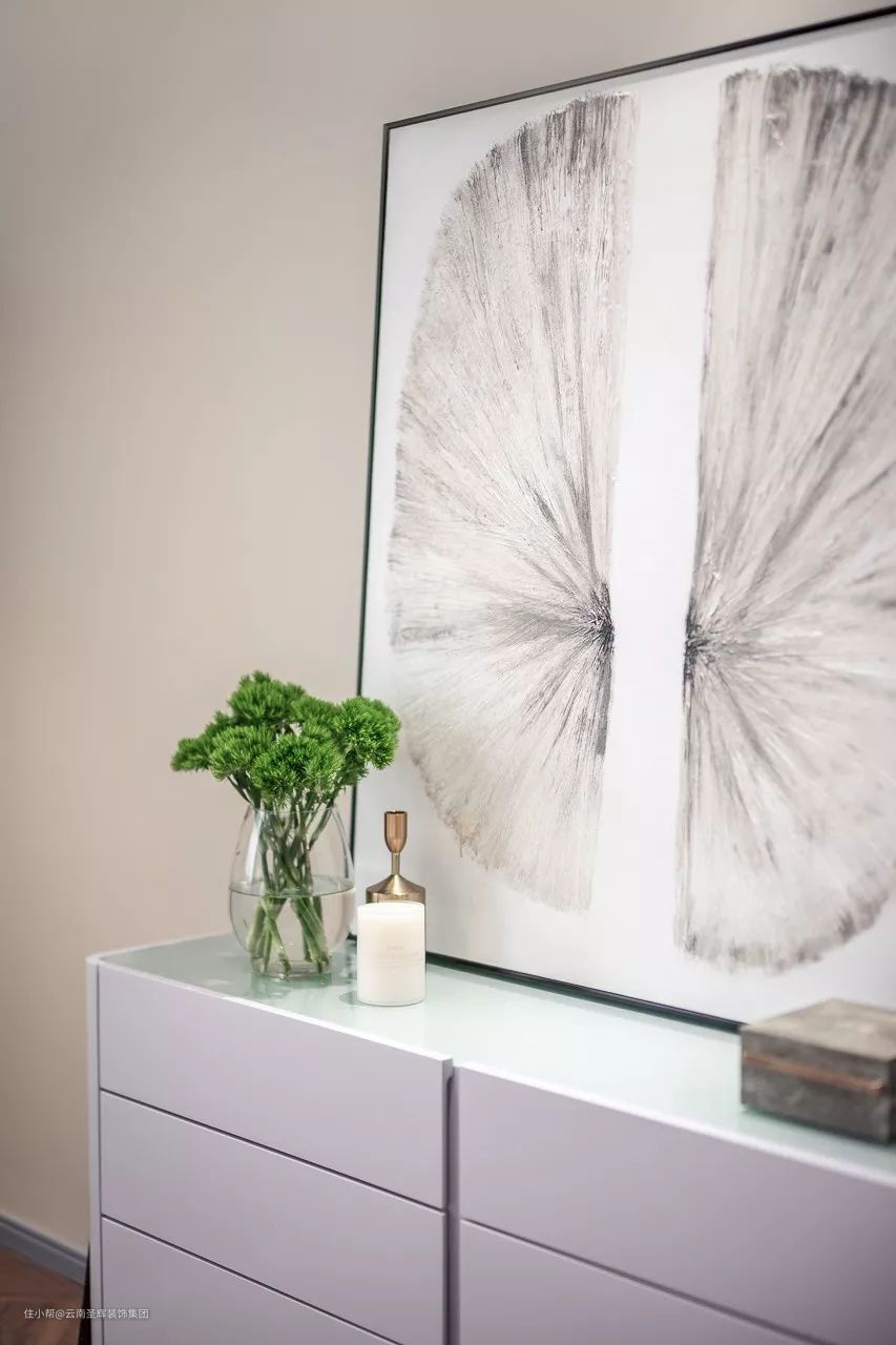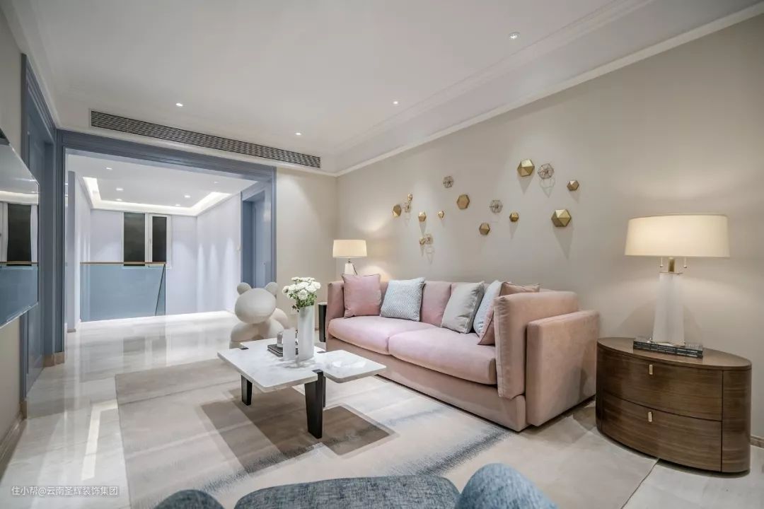 设计用莫兰迪的调色板在空间中画出一种生活美学,雾霾蓝、沁水粉、燕麦色……色彩上加以灰度的处理,予人纯净、自由且舒缓的感受,人的所有感官在这方静谧中感知着美好以及最恰好的温度。