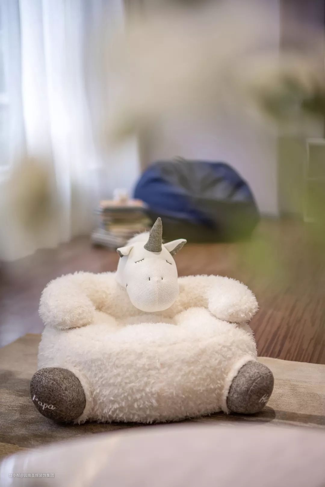空间摆放着L型同色系沙发、白色趣味动物座椅、懒人沙发、柔软的地毯,满足一家人的日常休闲需求;而儿童座椅的几抹海蓝色十分出挑,整体搭配在视觉上显得清爽雅静。