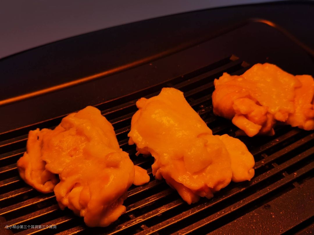整只鸡腿拆骨后,抹上少许盐腌制,直接放在烤盘上加热,鸡腿肉加热后收缩,烤炉的加热穿透性极强,即使是很厚的肉也能充分烤透,靠着鸡肉内本身的油脂就够了,不用刷油,烤出的肉也非常美味,一烤完就立马被吃个精光。