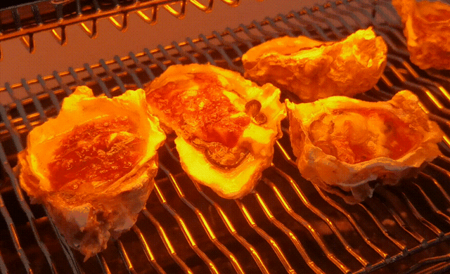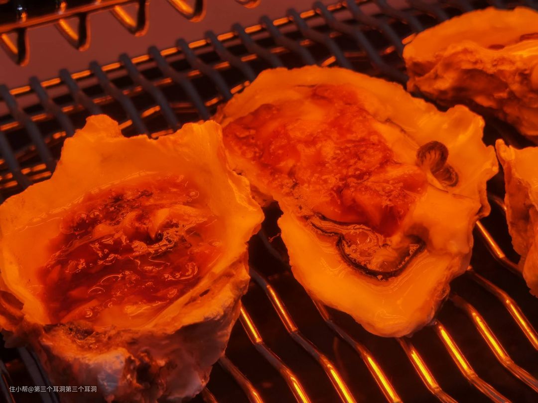 生蚝去壳后用净水清理干净,倒入少量自制的蒜蓉烧烤酱(蒜泥+油+糖+蚝油+生抽)。放在烤网上,烤炉的热是从上往下加热的,比起从下往上的传统烤炉,烤贝类熟的更快,放上一会就滋滋冒泡了,大大缩短了等待的时间。烤出来的生蚝非常鲜嫩。
