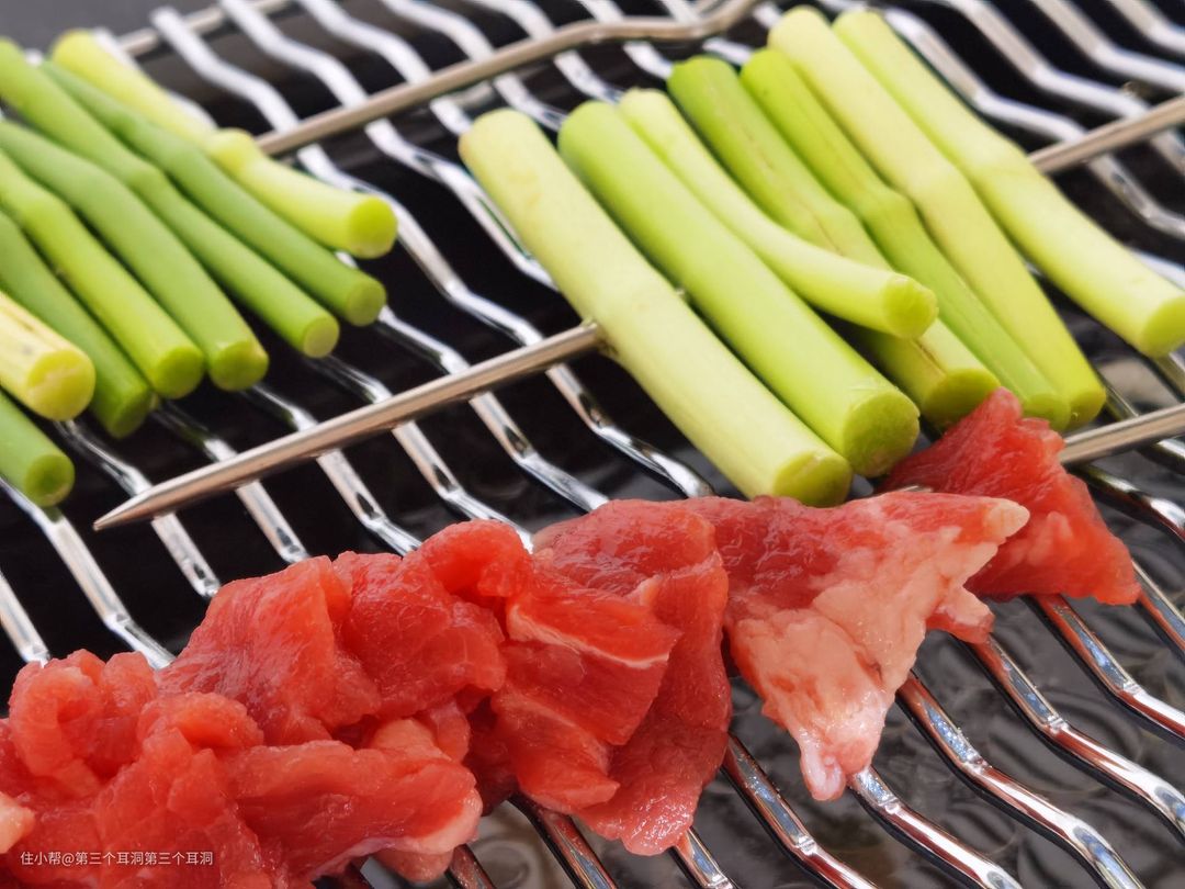 把事先准备好的蒜苗和肉串起来,烤的时候刷点油,即使是刷的油比较多的情况下,也是没有油烟的。
