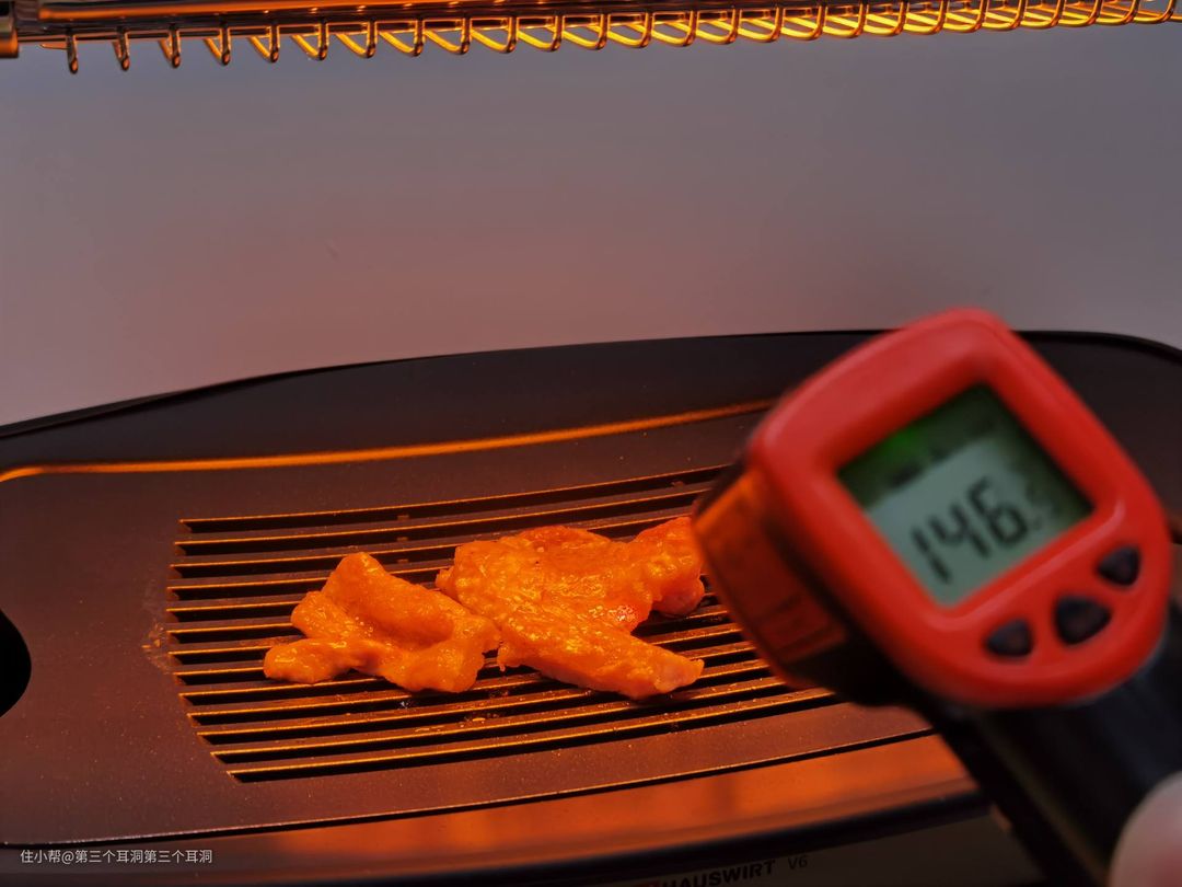 烧烤的最后,自然是LZ最喜欢的烤五花肉了,海氏 V6 无烟快烤炉用来烤五花肉简直就是最棒的组合了,五花肉是肥瘦相间的,传统的烤炉加热以后油脂特别多,烟也特别大,而海氏V6无烟快烤炉在烤的时候,油脂全都顺着凹槽滴下去了,吃起来更加健康,而且口味上也一点不差。LZ用了测温枪试了一下正在烤制的猪肉表面,温度在150度左右。