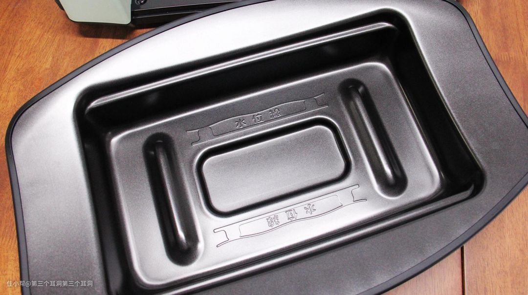 三是底部有接油盘,烤的时候里面装了水,油脂滴到水中,不会积攒热量,而且清洗很方便。