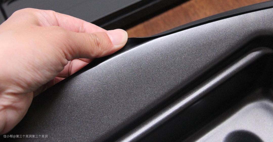 ▼再来看看烤炉的配件,4L容量的接水盘,用于接水,上方的油脂落入以后,会浮在表面上,清洁起来很方便。烤盘的周围还围了一圈隔热硅胶圈,防止烫伤。接水盘内还有安全水位提示线,防止干烧。