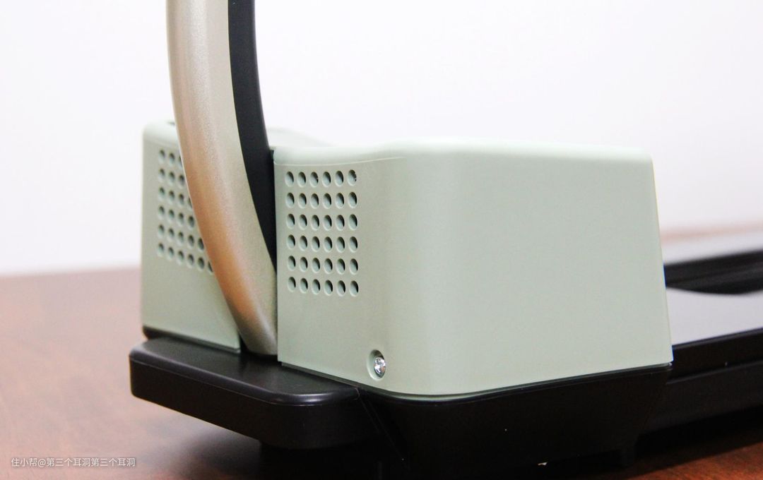▼左右2侧的支撑横梁是金属材质的,连接牢固,质感也不错。底座的左右2侧,也有大量的散热孔。