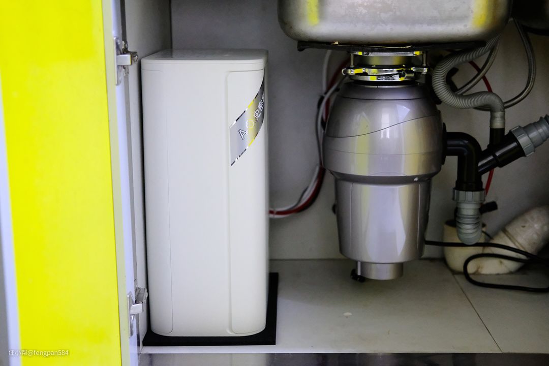 来看一下佳尼特净水器安装好之后放置在橱柜里的实拍图,观感上较为简洁,净水器圆润的机身显得较为小巧,会占用太多柜里面的空间,即便是空间里安装了厨余垃圾处理器看上去也不是很拥塞▼