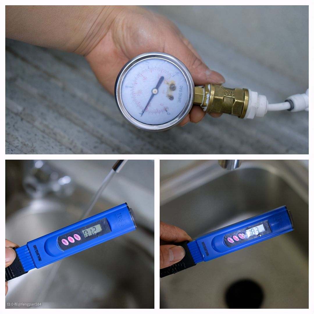 安装完毕后师傅还测试了家里的水压,设备显示水压标砖范围内,如果遇到水压过高的情况,可以三通球阀调节进水来减低水压,水压低的话可以通过另购增压泵来解决,最后安装完毕后测试了水质的TDS值,所得数值(12)也在标准范围内,自来水的数值为183,是纯水的十倍以上,整个安装环节就结束,前后不到一个小时时间,所以安装环节并不会耽搁用户太多时间▼