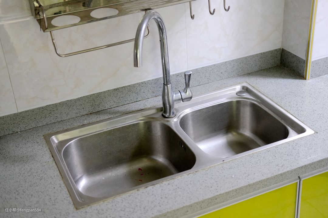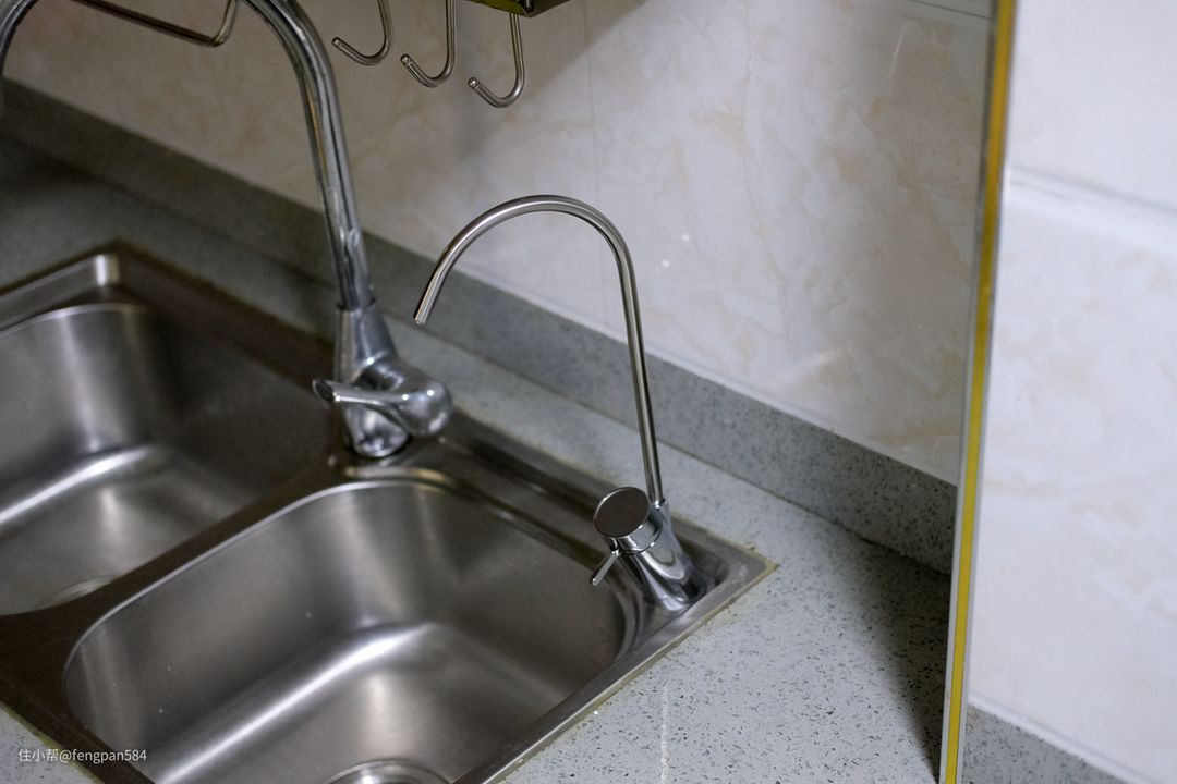 厨房在装修的时候买的不锈钢水槽是较新款的,在有边角处预留有净水器龙头的位置,这样安装过程会变得较便利一些▼