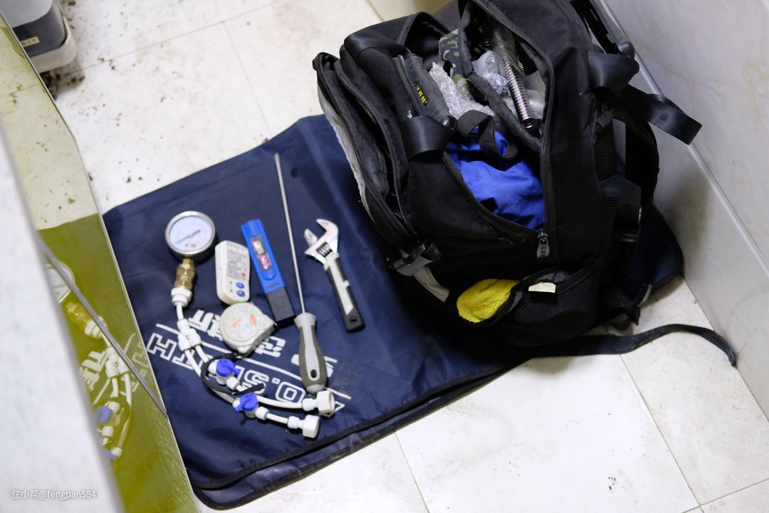 入户后安装师傅就是先查看安装环境,接着就把需要的工具摆放开来,放置有序,做得很贴心的是在工具下面还垫有一层保护垫避免损伤用户家里的地砖▼