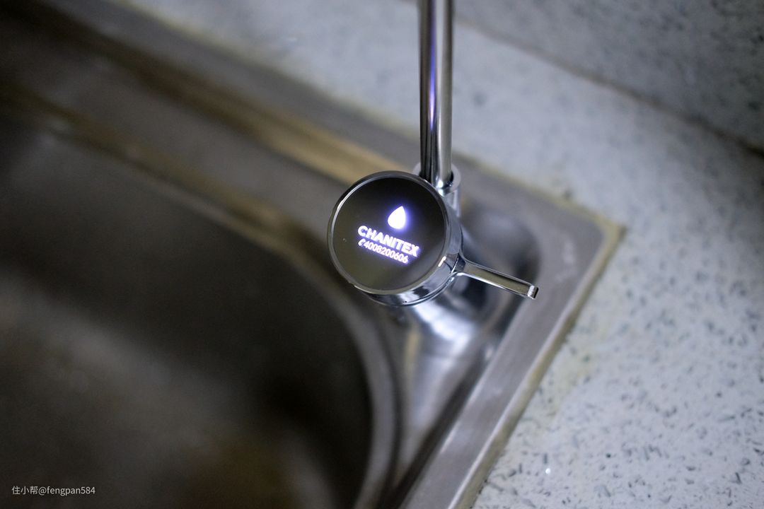 出水把手是机械式的开关,前后拉动实现出水/闭水,在开启水龙头出水后可以看到龙头的面板处会有LED灯亮起,冷光显示不刺眼,上面标注有CHANITEX的字母LOGO标识,在下方是400售后服务电话显示,在有需要的时候用户可以很方便的查看▼