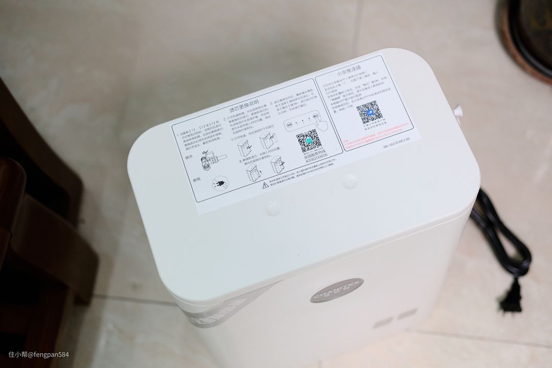 在机身的顶部可以很显眼的看到安装须知和小鲸鱼连接的贴纸提示,在使用几年后跟换滤芯可以参照操作很便利,在机顶部分还设置有三颗LED提示灯,工作时会常亮,在提示灯的两侧还设置有两个触控按键,分别是选择/复位的功能▼