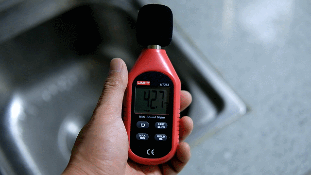 ▼在净水器运作的时候测试了下噪音值增加约10分贝,所产生的声音并不大。