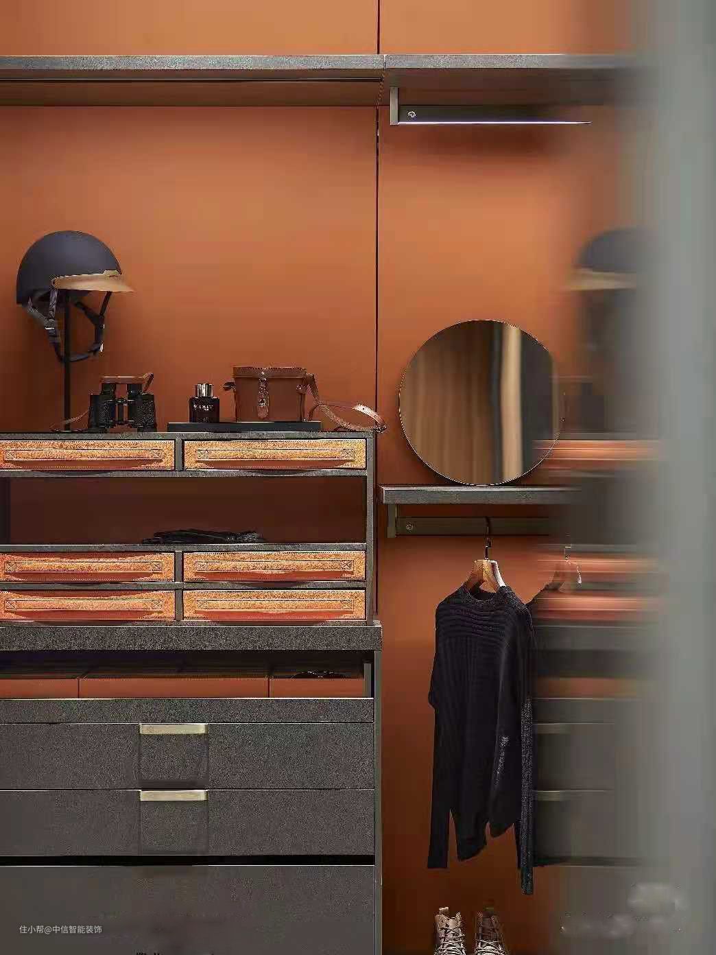 爱马仕橙搭配上深灰色,跳跃出意大利独有的文艺语言,具有冲击力的色彩搭配却意外的契合,将饱和度较高的橙色融入进高级灰中。恰到好处的木饰面与金属五金搭配,赋予家具多元的风格,尽显个性与品味。