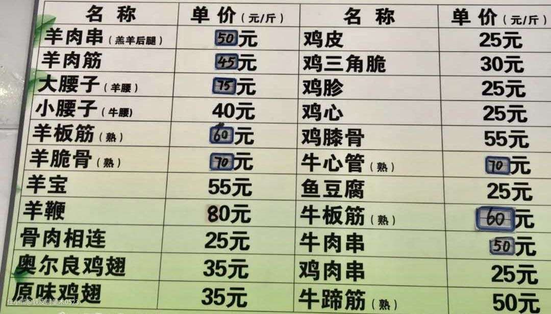 原材料:各种串:羊肉串、羊肉筋、大腰子、鸡脆骨、羊脆骨等等。也可以单独买羊后腿,切成肉片,比买串价格更优惠一些!