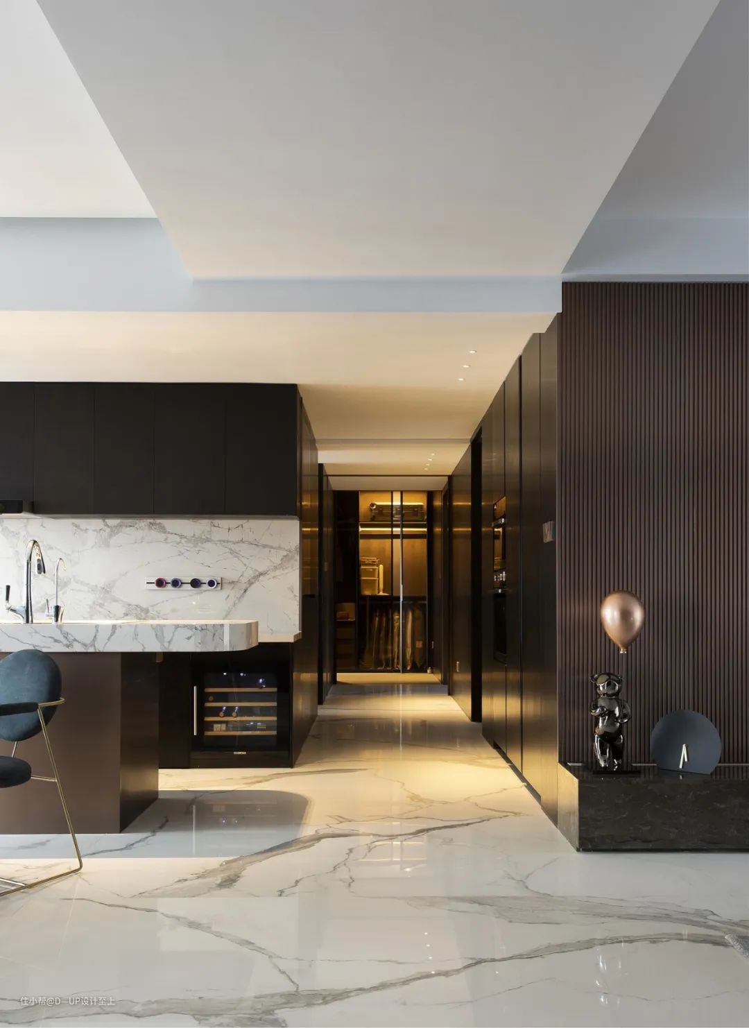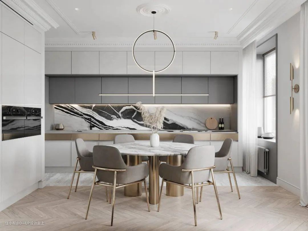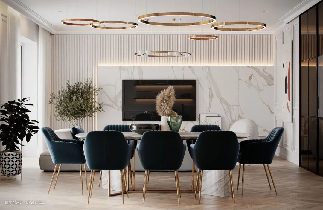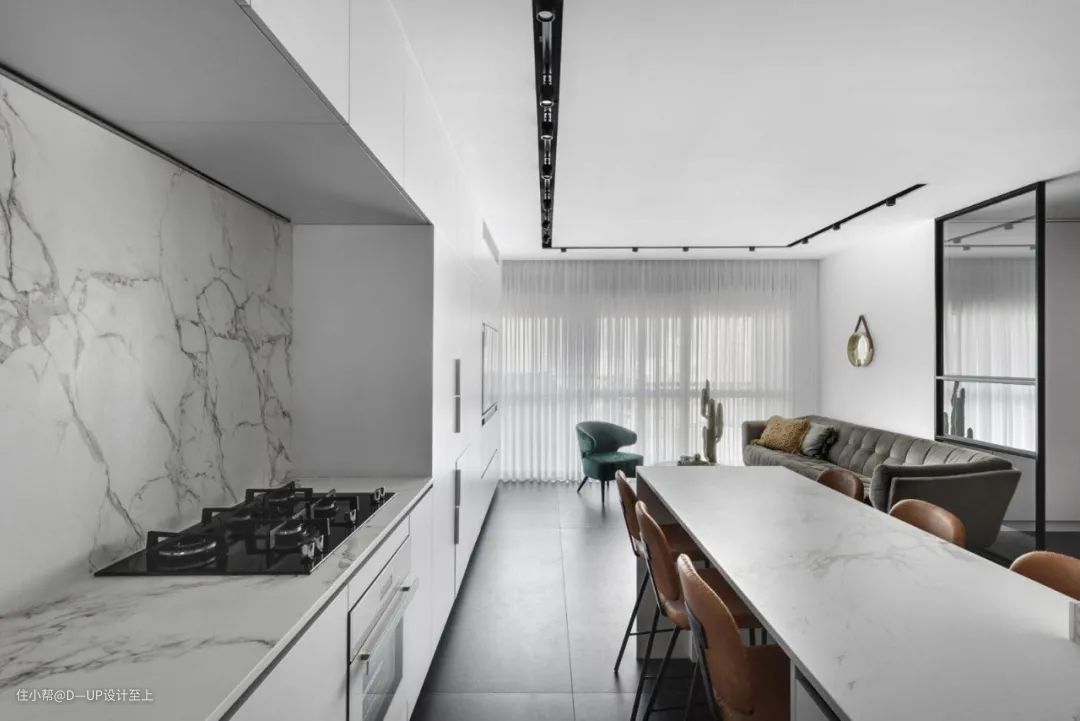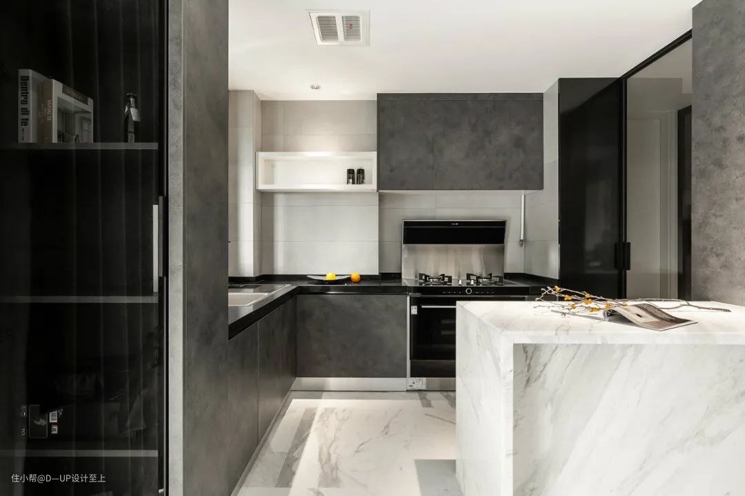 高端大气的岩板花色搭配岩石般的质感,可大面积运用在背景墙的装饰,提升整个空间的设计感和格调,营造出深邃、沉稳的空间感。