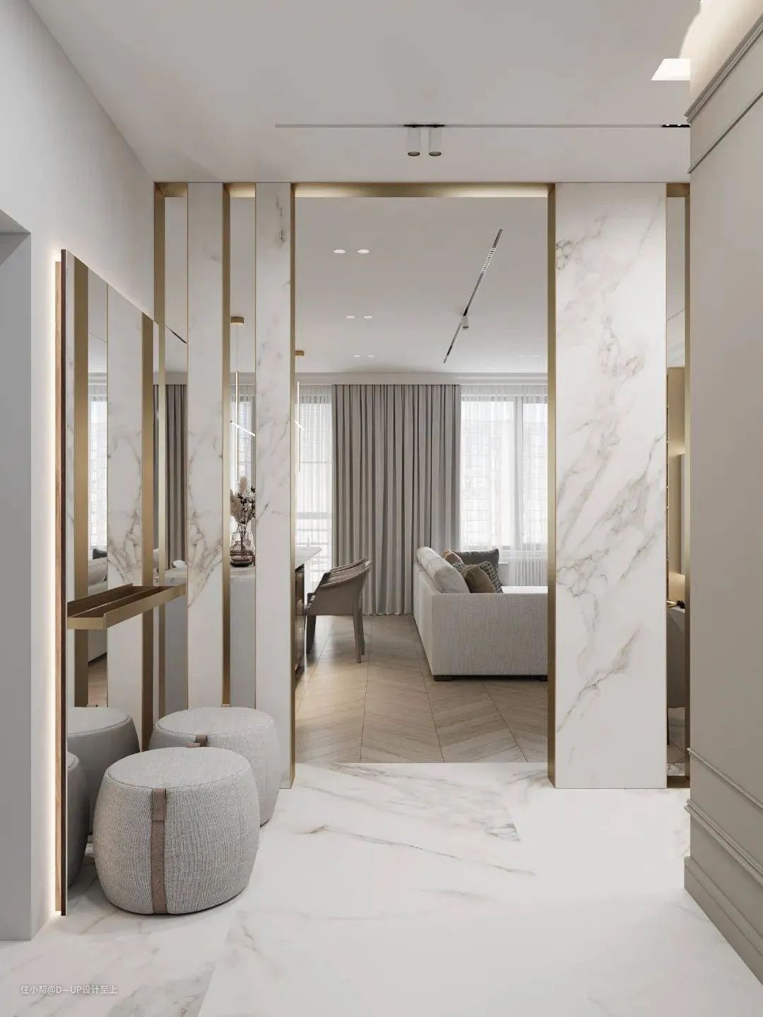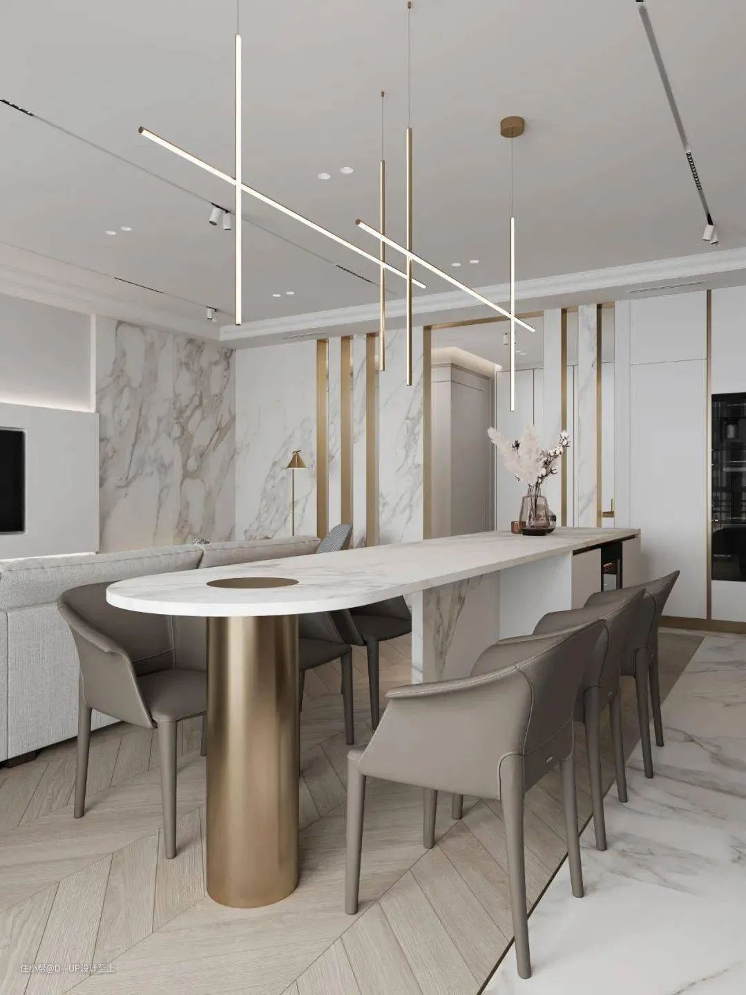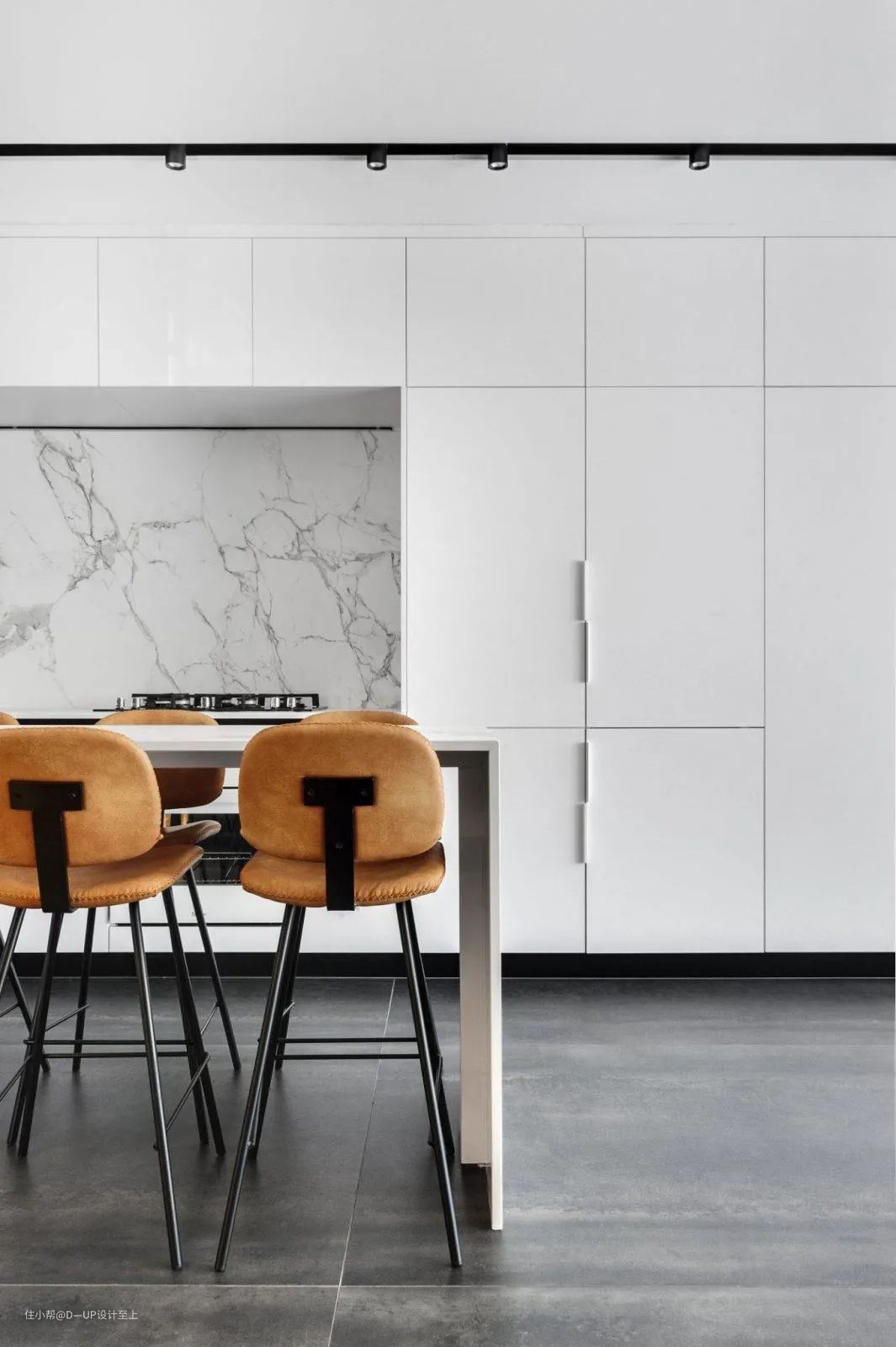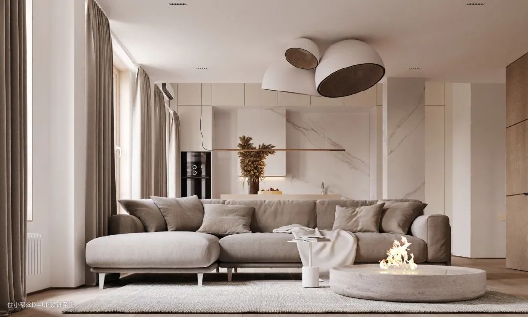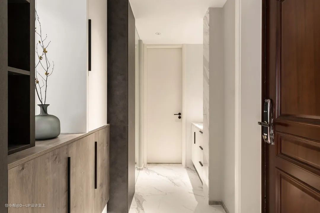 高端大气的岩板花色搭配岩石般的质感,可大面积运用在背景墙的装饰,提升整个空间的设计感和格调,营造出深邃、沉稳的空间感。
