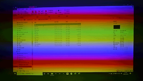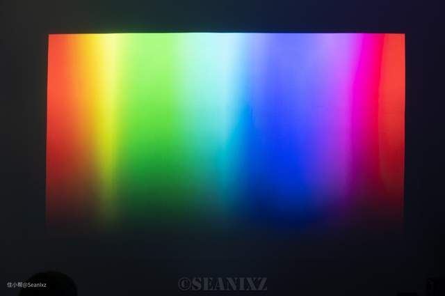 我用高速快门看了下屏幕,特定快门速度下可以看到分离出来的三色光,工作模式应该是三原色不断地交替刷新达到的效果,可能屏幕刷新频率和校色仪的采样频率不同,没有专用的激光投影测试模式,所以无法用校色仪测试出色彩了。