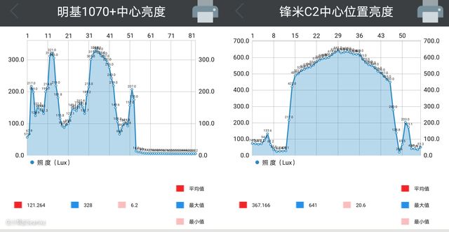 明基1070+在138Lux左右,峰米267Lux,模拟幕布反射到人眼的光照强度来看,也是差不多一倍的关系,