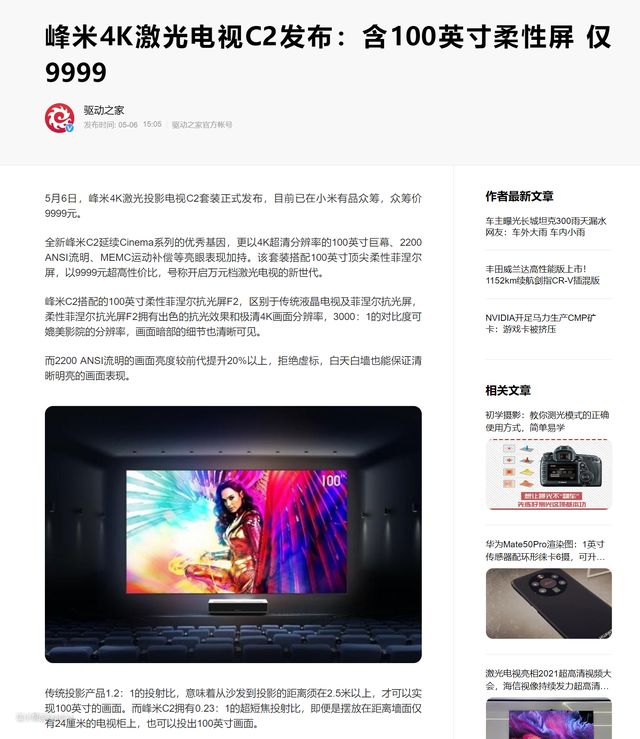 价格确实十分有吸引力,最近也入手了这台小米生态链企业峰米科技的峰米激光电视C2,那么就来一起看看实际表现吧。