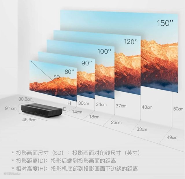 市面上大部分的投影仪达不到激光电视的参数要求,基本上都需要横跨整个客厅的距离来实现大尺寸投影了,这导致线材需要从常规摆放电视盒子和家庭影院前部走到客厅后部,增加了施工难度。虽然也有超短焦投影的形式,但距离仍无法与激光电视相比。