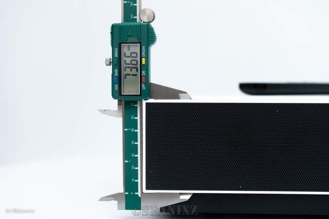 产品尺寸456×308×91mm,外框高度仅73.66mm,体积比家庭影院的功放要小很多,整体视觉效果较为轻薄,采用了白色的主色调,颜值还不错。重量7kg,也不是非常笨重,可以轻松移动。