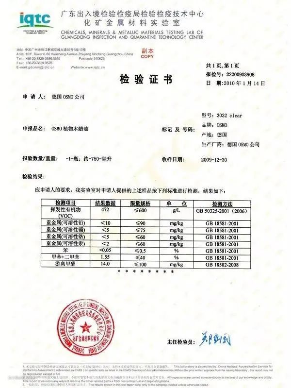下方是德国木蜡油品牌欧诗木的送检结果,其中甲醛、苯系物都能检出。