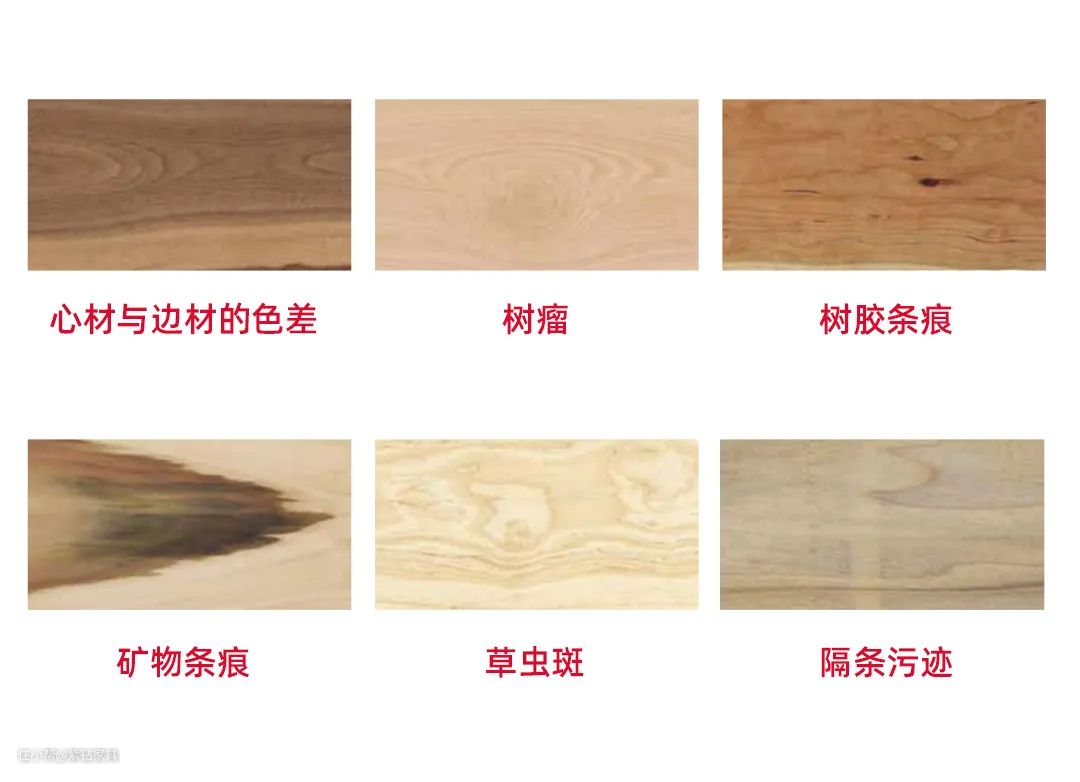 还有就是,大部分实木材料都有天然瑕疵。比如树瘤、虫眼,或是树胶条痕、心材与边材有色差等。