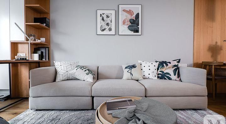 以文艺白为基调,搭配地面、墙面的原木色,用灰色布艺沙发、整排的书架布置,硬软装相合打造出简约的美感。