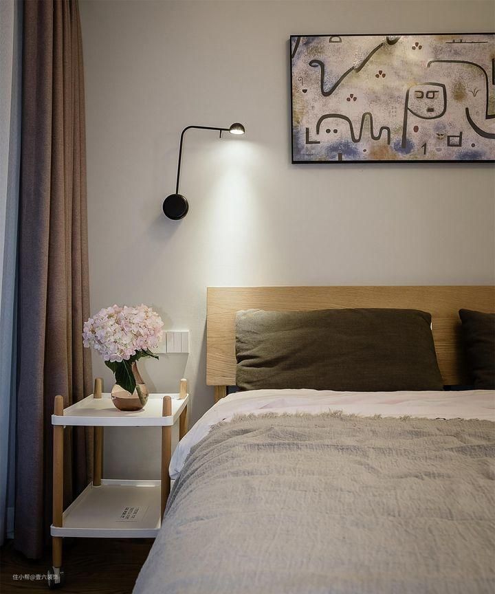 主卧莫兰迪色系的墙面,让环境稳重但不沉闷,营造出温馨的环境。床买的加长靠背的,还提前和安装师傅打好招呼,根据使用高度在靠背上安装了插座。