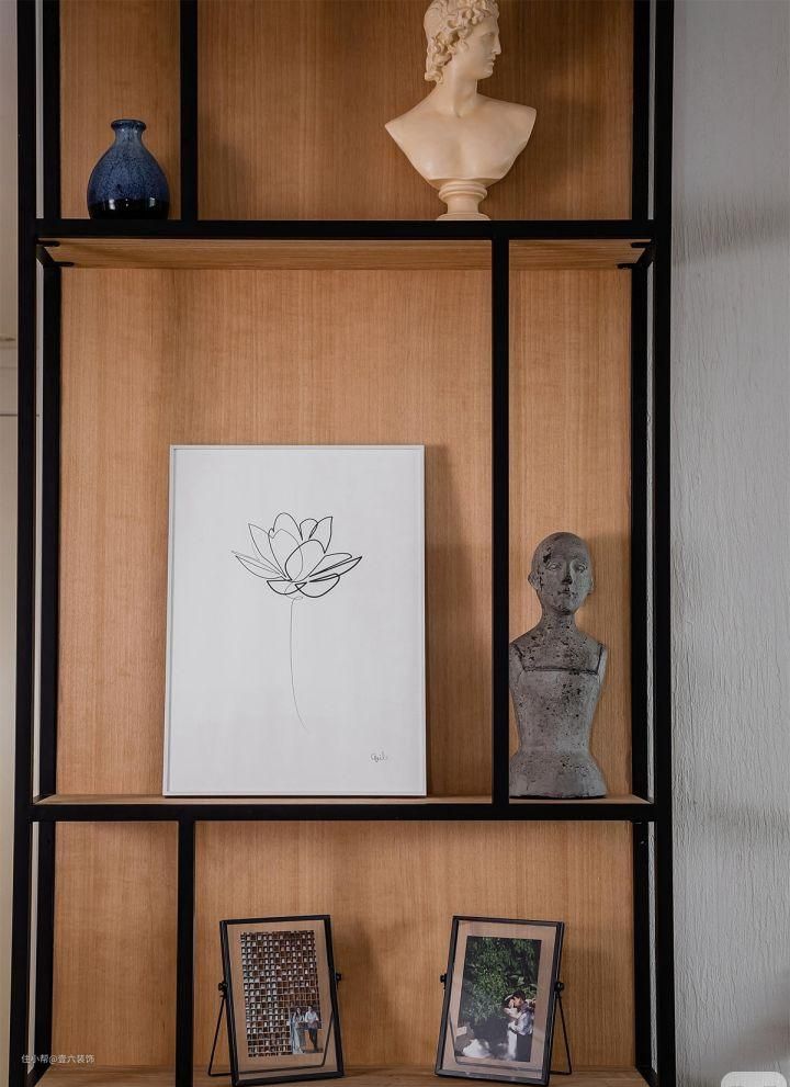 走廊用白墙和白色柜体作为基底,白色为主的开放式装饰柜上增添原木色的置物架,可以展示各种的艺术品,给原本索然无趣的走廊带来趣味性。
