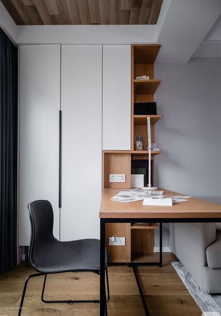 书桌是现场木工打制的,书桌一旁的开放式书柜也是用KD板现场制作的,给人由心底而发的舒适感。