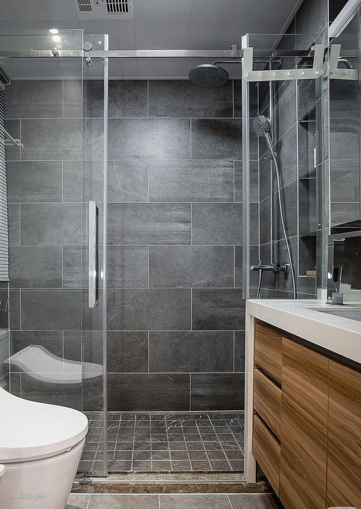 卫生间贴灰色砖,符合年轻人的审美、简约经典也很大方时尚。使用了不同尺寸的灰色砖,墙面工形字铺贴的长方砖时尚大气,地面小方砖更展现日常的精致感。