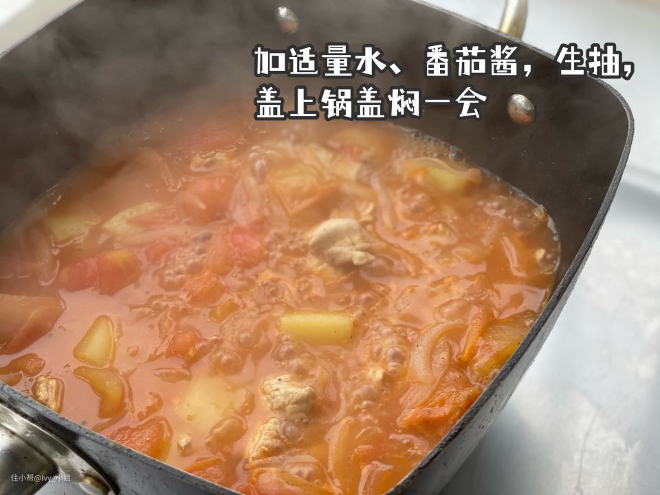 4 等番茄变软以后,加适量的水、番茄酱、生抽,然后盖上锅盖焖一会儿,目的是让胡萝卜土豆焖熟,等到他们俩服软了就可以饶了他们俩了,这时候汤汁也已经很浓稠了,关火吧。