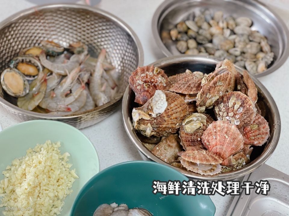 1 我这里准备了虾,蛤蜊,扇贝,八爪鱼和鲍鱼,记得提前把蛤蜊和扇贝清水浸泡一会儿,大虾剪掉虾脚之后用姜丝、生抽、耗油、白糖腌制一会儿。爱吃粉丝的小伙伴们也可以提前泡发粉丝,最好用冷水,吃起来会比较有韧性。