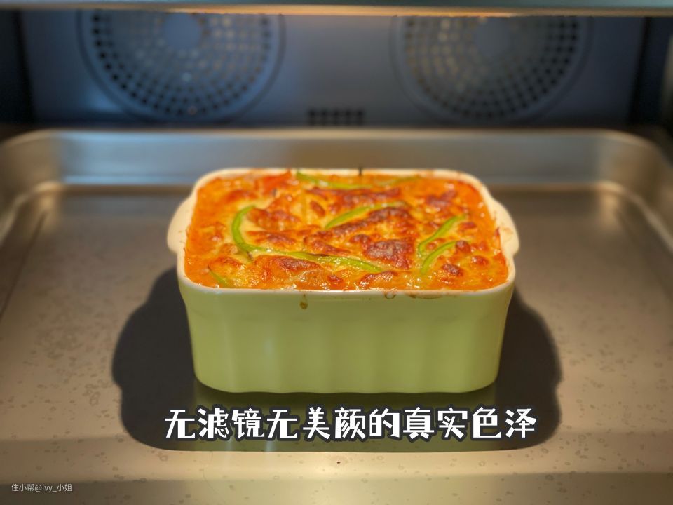 7 然后就到蒸烤箱大显神威的时候了,先预热到200度,然后把烤碗放进去,大概15分钟就好了。去玩一会儿吧,或者透过玻璃偷偷看看芝士慢慢融化的过程,也是一种享受。