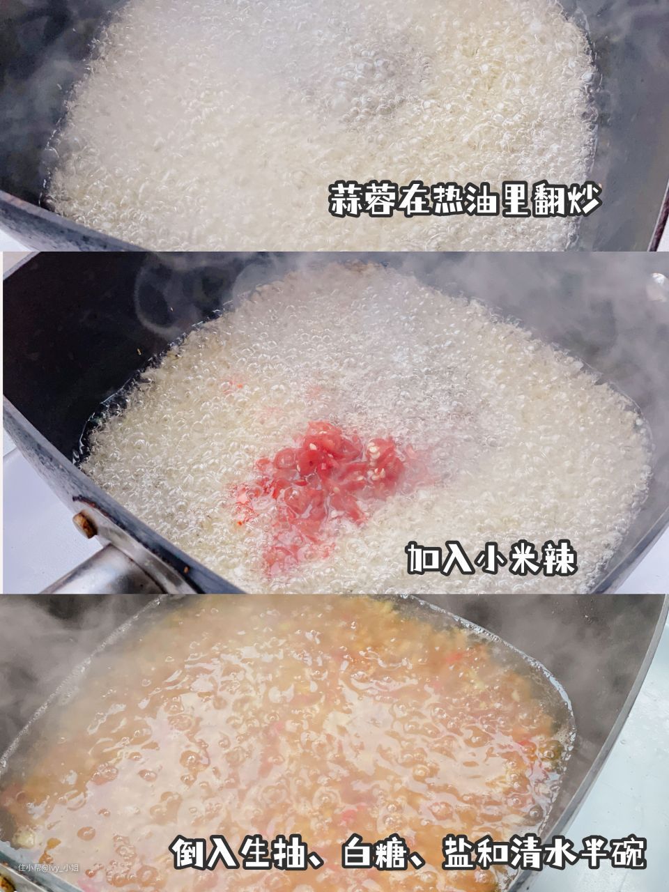 2 下一步就是做蒜汁啦,很重要的!把可怜的大蒜扒皮拍扁,剁成蒜蓉,然后在热油锅里翻炒,飘出蒜香之后,倒点生抽、白糖、盐,然后放半碗清水。烧开以后就开小火把,熬一会儿之后大火收汁。