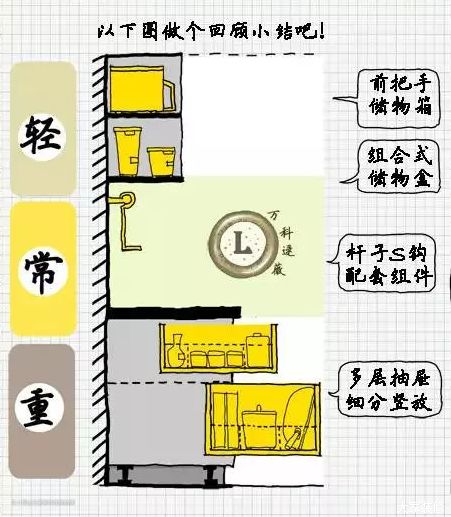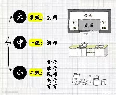 当然,任何物品的收纳都离不开载体,厨房的收纳载体一共可分为三级: