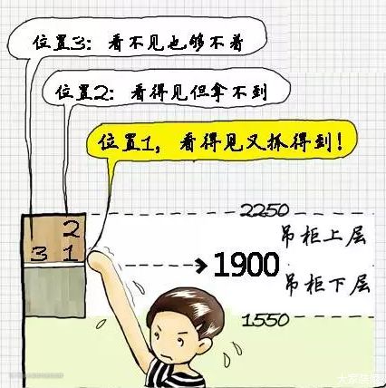 与一伸手就能拿到物品的吊柜下层不同,吊柜上层板的起始高度一般都在1.9cm,考虑到地柜对人的站立位置的影响,吊柜上层几乎是正常身高女性能够到的显现高度了。换句话说,对于上层吊柜而言,下图中层板最边缘的位置“1“还算可抓取的。这就是吊柜收纳的突破口