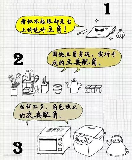 虽然今天的话题是“收纳”,但不要忘记,中心区的首要功能并不是收纳置物,而是烹饪操作区。如果把台面视为一个舞台,那么演员们的定位大致如下: