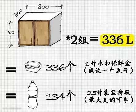 常常感觉吊柜实际放不了多少东西,一下子就满了?吊柜容量其实远超过预期。试着计算一下,以2个下图尺寸的吊柜来计算,容量都是非常惊人的。