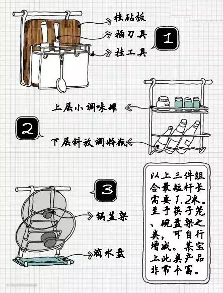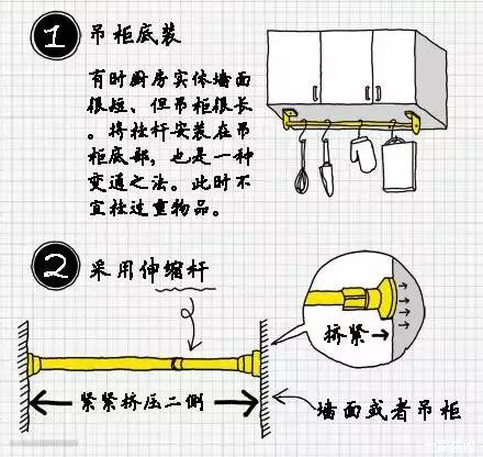 把横杆装订在吊柜底部,或用伸缩杆,靠物理特性紧挤侧墙,所以相对粘钩吸盘也要牢靠很多。比如我家橱柜局部就安装了一根1.8米长的伸缩杆。每天悬挂砧板等重物,从未掉落。不过为了安全起见,不要挂太沉的锅具和刀。