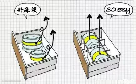 竖着放是收纳的基本原则。假设有五六个盘子摞在一起,想要取中间的盘子就会非常麻烦。抽屉细分之后,竖着插入盘子不容易倒,这时候拿任何一个盘子都可以轻松取出,不会干扰其他的。同时这样也避免了盘子积水的情况。