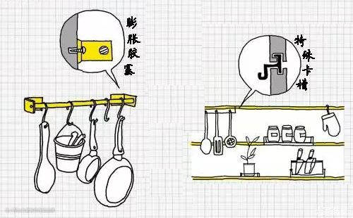 另外一种就是墙面安装,更高端进口的整体厨房中常常会看到。相当于在墙面非瓷砖材料中嵌入暗槽,配套各种专用挂件。优点是整洁干练,无需打孔。缺点是这种安装方式在国内尚不普及,后期无法更换加载。