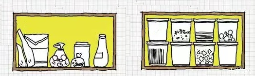 但为啥我们自己用起来好像总不是那么回事呢?其实,我们没有找到合适的载体。打开很多家庭的吊柜,可能是图中左面那样的,柜子上方的空间完全浪费掉了,物品参差不齐摊放,无法利用吊柜的容量。如果换成立方容器效果就会完全不一样,参见右面的例子,将物品拆除原本的包装,放入系列规则的容器中,有效使用立体空间,杜绝空间的浪费!